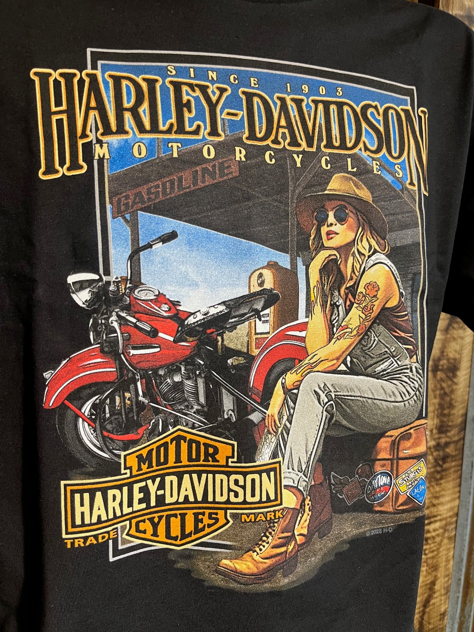 Men's black shirt with softail traveler design. Material is 100% cotton.