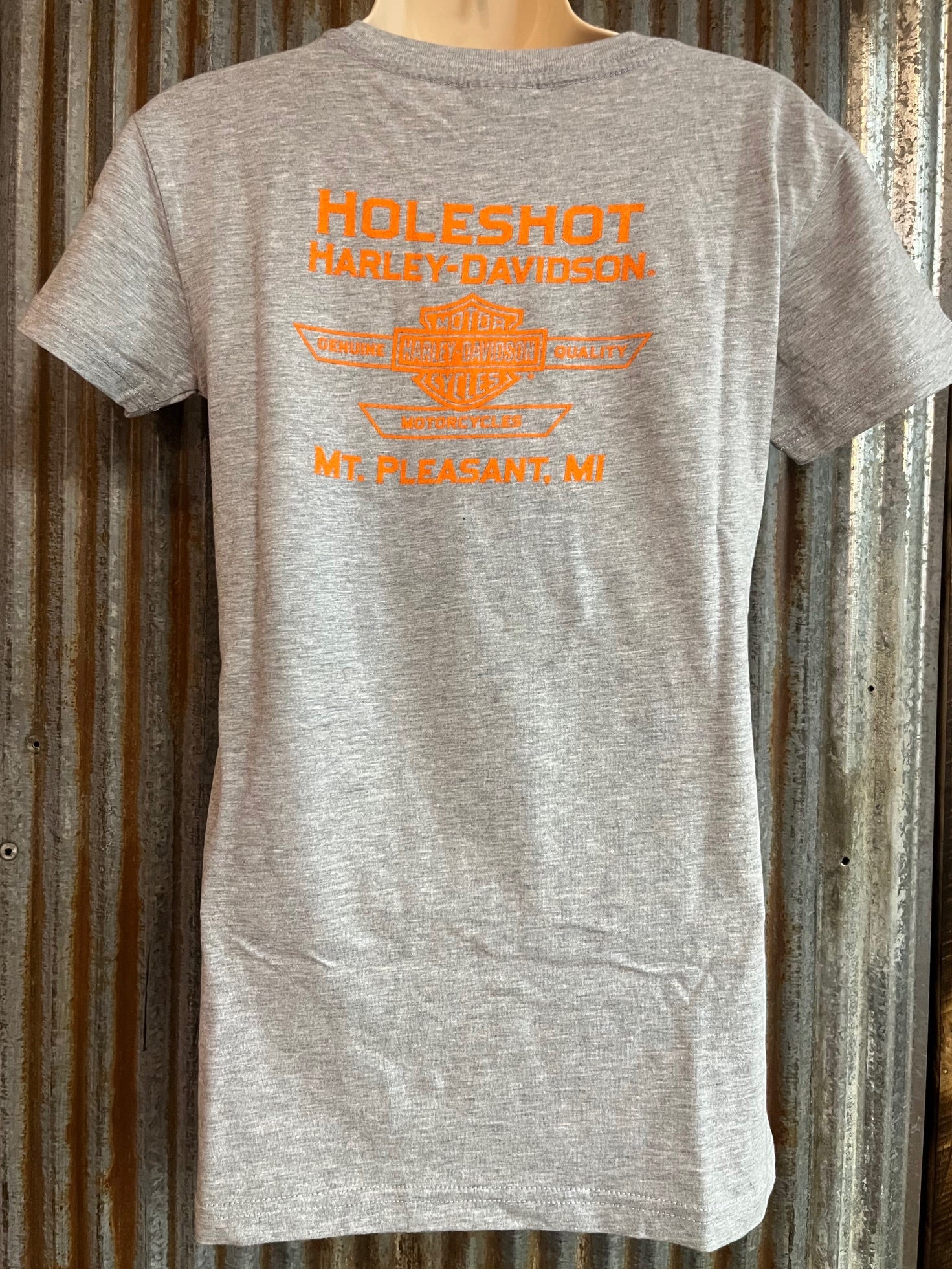 Women's grey eagle short sleeve shirt. Design has raised smooth gold rivets inside Harley Davidson text. Dealer logo is orange screen print on back. Material is 80% cotton 20% polyester