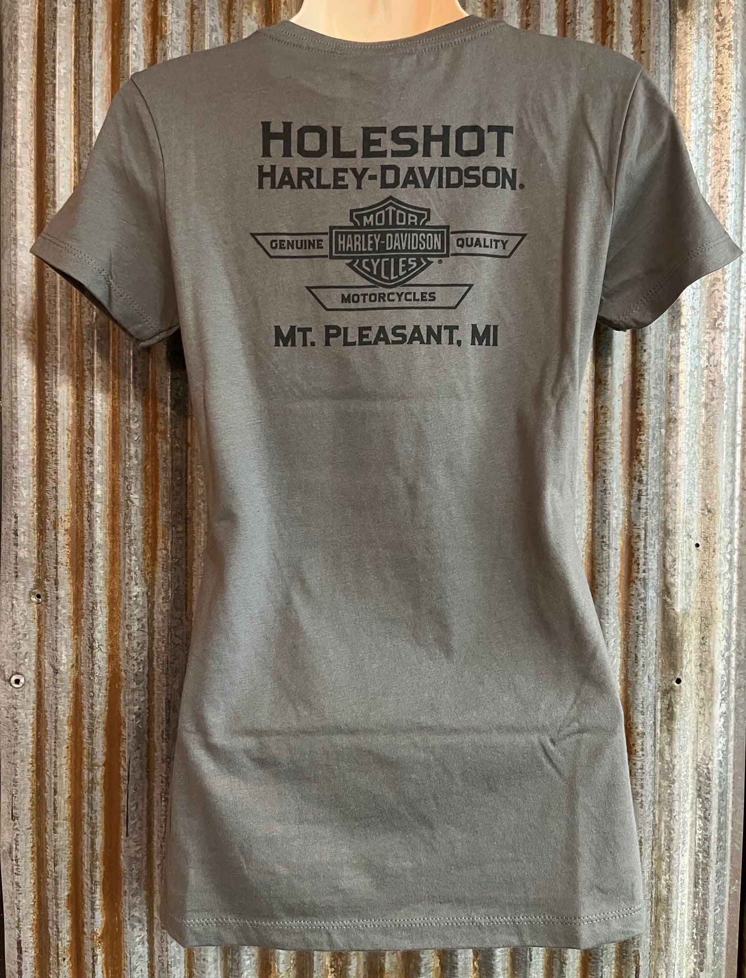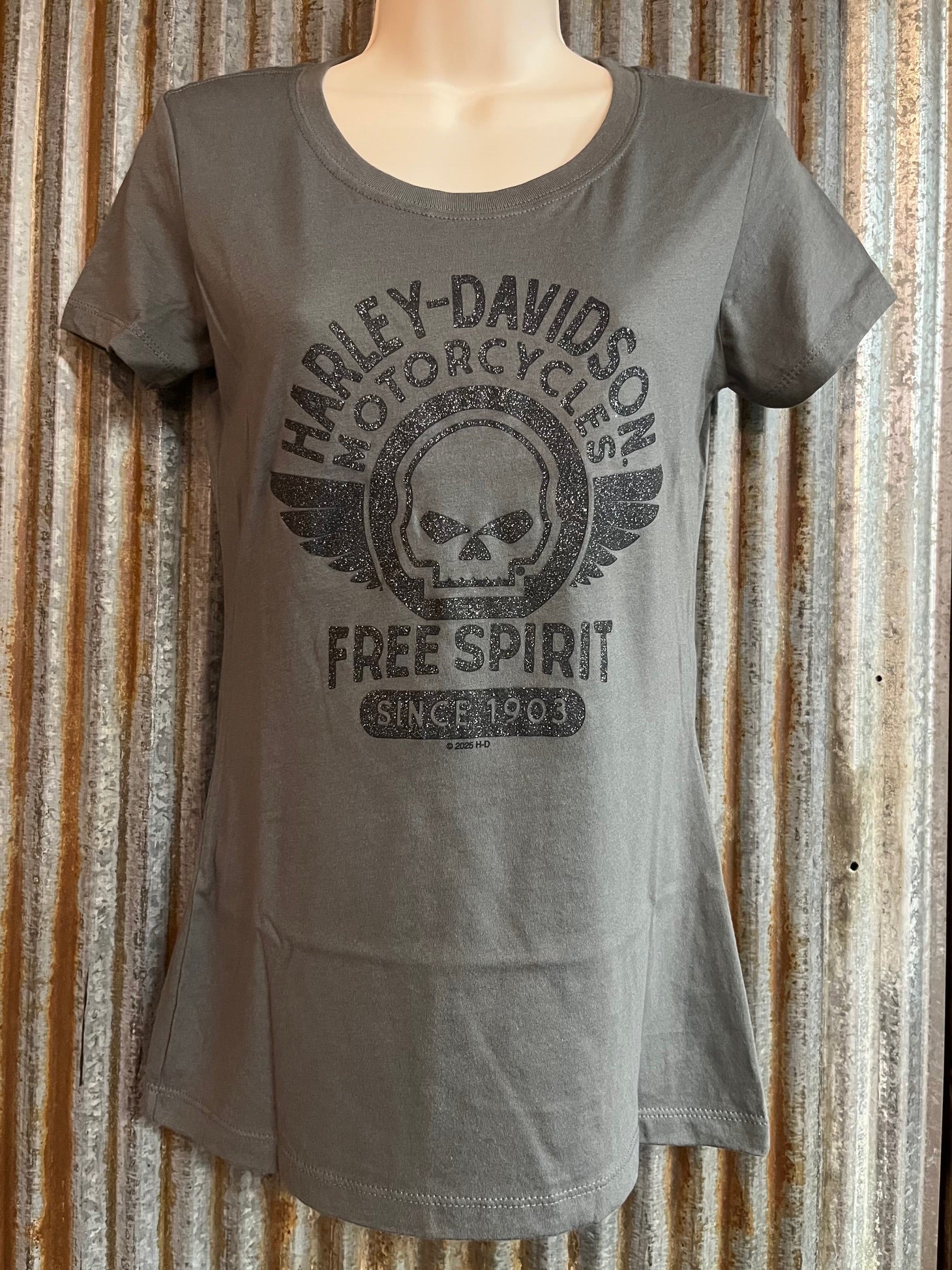 Women's grey Willie G short sleeve shirt. Front design is glittered ink. Material is 60% cotton 40% polyester